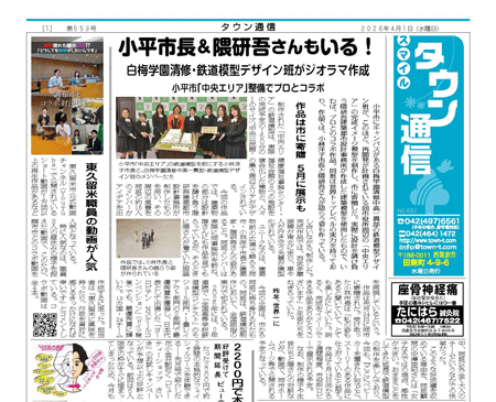 タウン通信・553号(2026年4月1日発行号)をPDFでお読みいただけます。 今号では、小平市にキャンパスがある白梅学園清修中高一貫部・鉄道模型デザイン班が、小平「中央エリア」の鉄道模型を仕上げて市に寄贈したトピックや、東久留米こどもミュージカルの15周年記念公演のことなどを紹介しています。 今号