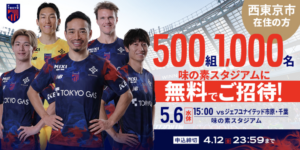 サッカーJ1「FC東京」の5月6日(水・休)、味の素スタジアムで開催のホームゲームに、西東京市在住者500組・1000人が招待される。対戦チームはジェフユナイテッド千葉。 西東京市はFC東京のホームタウンになっている。 応募は4月12日まで。応募等の詳細は下記ご参照を(応募時に、JリーグIDの登録・