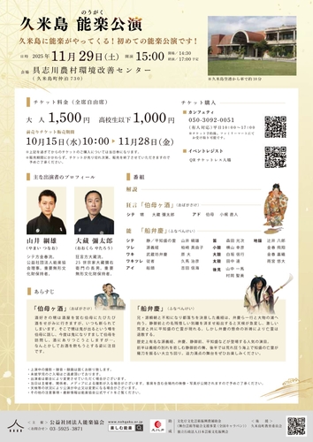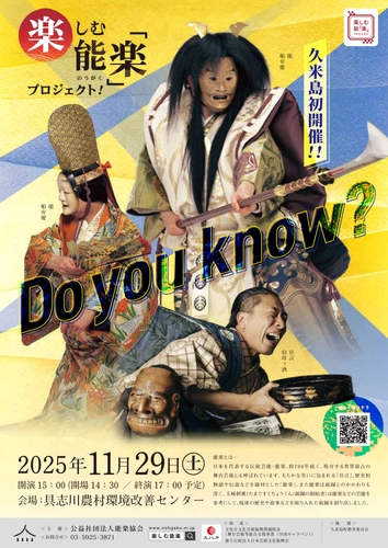 公益社団法人能楽協会主催、『楽しむ能「楽」プロジェクト! 久米島 能楽公演』が2025年11月29日(土)に具志川農村環境改善センター(沖縄県島尻郡久米島町仲泊730番地)にて上演されます。