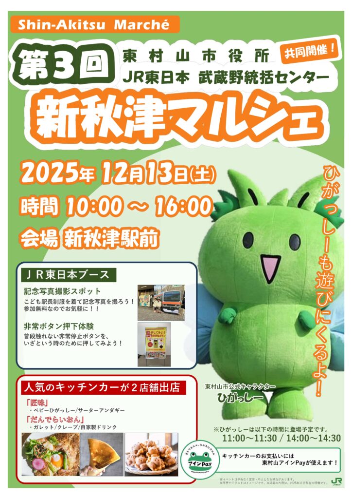 新秋津マルシェ、12/13、新秋津駅前で ひがっしー、キッチンカーなど登場、非常ボタン押下体験なども