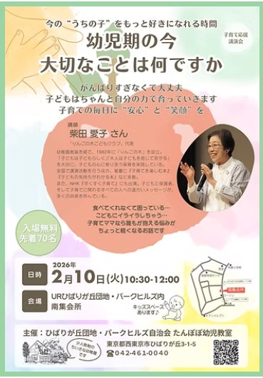 柴田愛子さん講演会「幼児期の今 大切なことは何ですか」 2/10、ひばりが丘団地で