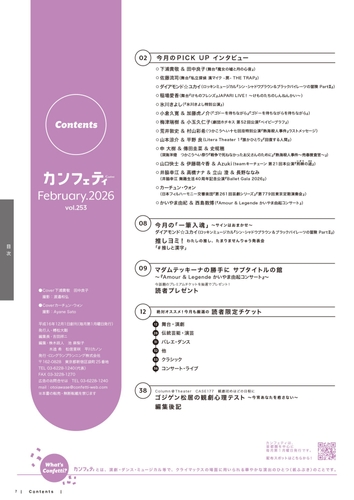 今月号の表紙には、日本フィルハーモニー交響楽団『第261回芸劇シリーズ』『第779回東京定期演奏会』よりカーチュン・ウォン、舞台『魔女の嘘と月の心音』より下浦貴敬&田中良子が登場。