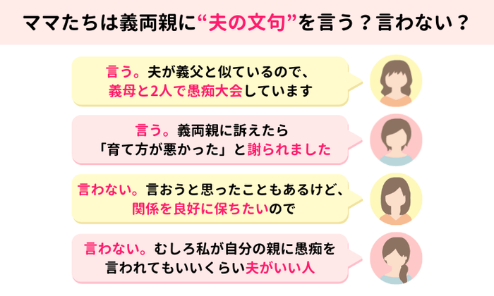 受け止めてくれる、聞き流してくれる、あるいは先回りして注意してくれる……。義両親にそうした信頼があれば「言える」と感じ、息子擁護に徹すると予想されると「言わない」という選択になるのでしょう。