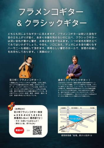 宮川明フラメンコギター教室主催、『フラメンコギター&クラシックギター』が2026年3月15日 (日)にタワーホール船堀 小ホール(東京都江戸川区船堀4-1-1)にて開催されます。 チケットはカンフェティ(運営:ロングランプランニング株式会社、東京都新宿区、代表取締役:榑松 大剛)にて発売中です。