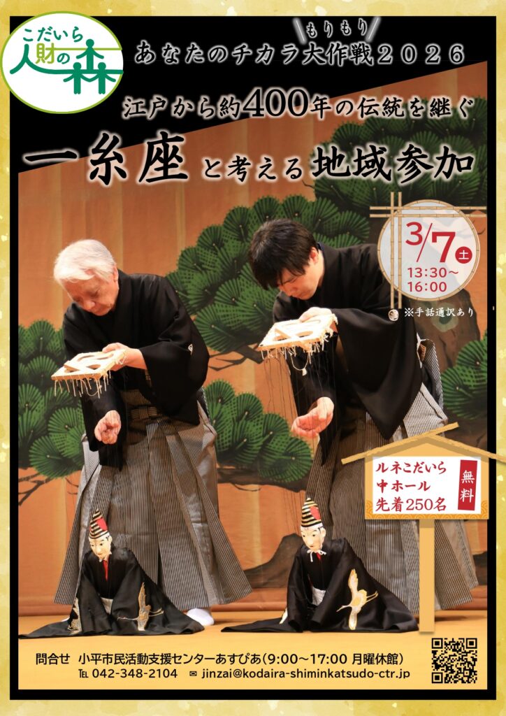 小平市を拠点に活動する人形浄瑠璃「一糸座」が、3月7日㈯、小平市ルネこだいらで公演とトークを行う。