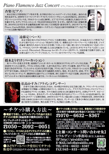 ピアノの音色、フラメンコのリズム、ジャズの感性が出会う圧巻のステージ。ジャンルを超え、みるものの心を震わせる演奏と踊り、それぞれの個性あふれるパフォーマンスをお楽しみに!