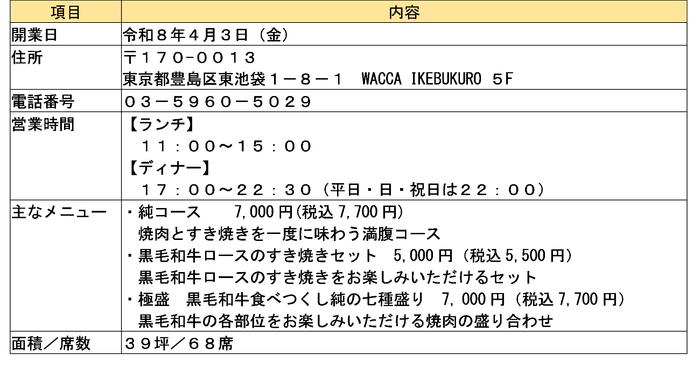 開業から11年が経過した「焼肉本舗ぴゅあ池袋店」を「焼肉・すき焼き純 池袋店」にリニューアルし、焼肉に加えて、国産黒毛和牛の「すき焼き」もお楽しみいただける店舗として、ご家族連れや会食など様々なシーンで利用いただけるメニューを提供します。