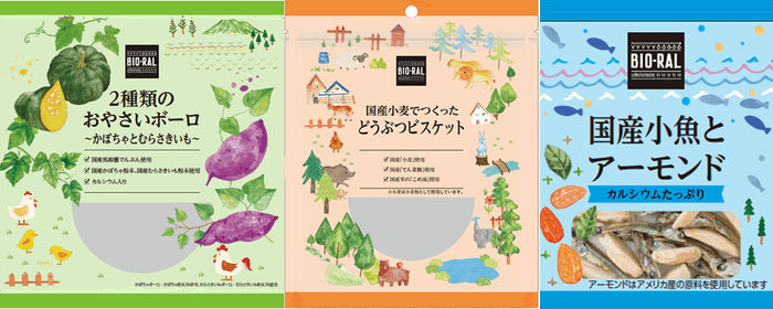 当社が運営しているナチュラルスーパーマーケット「ビオラル」は、多くの子育て中のお客様にご来店いただいています。その中で、「子どもの口に入るものは、とことんこだわりたい」「おやつは安心できるものをあげたい」などといったお声が寄せられています。そういったニーズにお応えするべく、食品添加物に配慮し国産素材や優しい味わいにとことんこだわったお菓子15種類を新発売いたしました。定番のボーロやソフトせんべい、ビスケットやカルシウムたっぷりな小魚とアーモンドなどを展開しております。