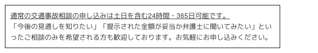 それぞれの交通事故ごとに特性があり、保険会社との最善の交渉方法が異なってきますので、ぜひ交通事故分野に強い弊所にご相談いただくことをお勧めします。」