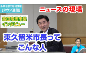 10月30日、東久留米市長選挙への立候補を表明している現職・富田竜馬市長への合同インタビューが実施された。 12月14日投開票の市長選挙に向けて、複数の新聞社が求めたもので、政策よりも、主にプロフィール・人柄(横顔)を紹介することを目的にしている。 今回はタウン通信も参加できたので、その様子を動画に