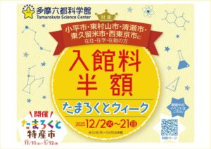 多摩六都科学館では、12月2日(火)から21日(日)まで、たまろくとウィークを開催する。 圏域となる、西東京・小平・東村山・東久留米・清瀬の5市に在住・在勤・在