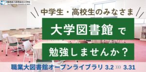 小平市にある職業能力開発総合大学校が、3月2日から3月31日まで、中高生を対象に、図書館を無料開放する。 自由に学習などができる。多目的学習室は、モニターやポータブルバッテリー、学内無線Wi-Fiも設置。 食堂も利用できる。 詳細は同大学校ホームページ参照を。