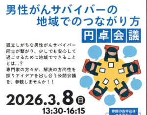 孤立しがちな男性がんサバイバー同士が繋がるにはどうすればよいのか――がん経験者や専門医らが意見を交わし合う「円卓会議」が、3月8日(日)午後1時30分から4時15分まで西東京市イングビルで開かれる。 「男性がんサバイバーの地域でのつながり方」と題した会議で、孤立を防ぎ、地域で安心して過ごせる道を探る
